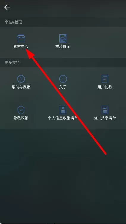 2、在功能菜单页面,点击素材中心选项,进入素材中心页面。
