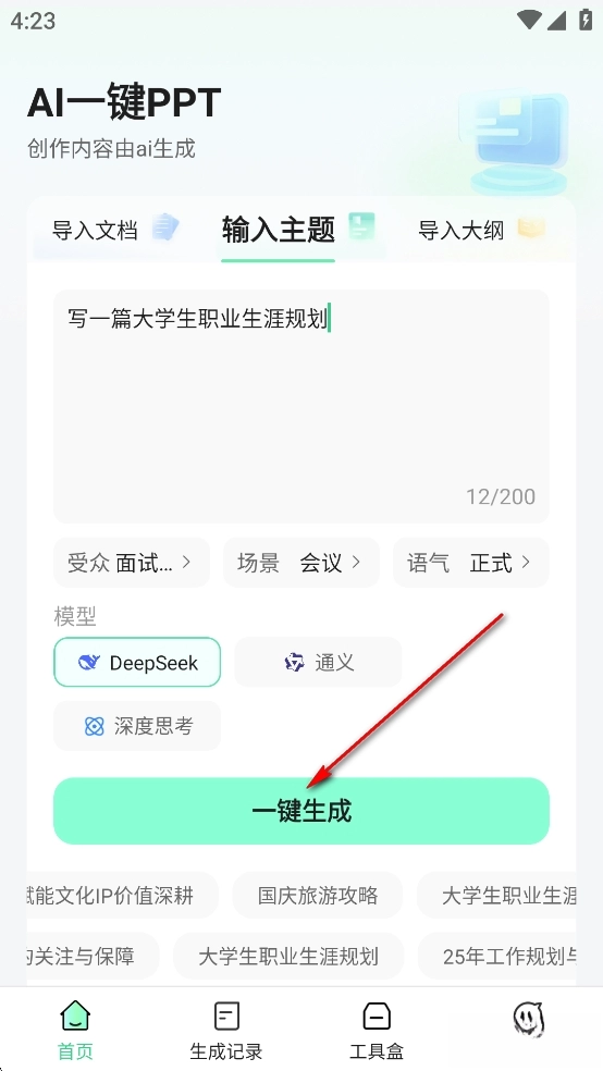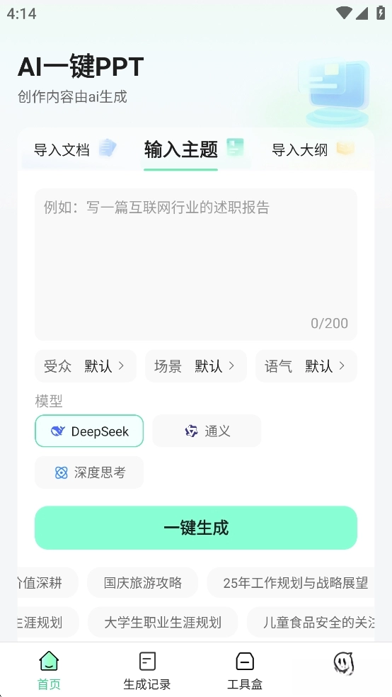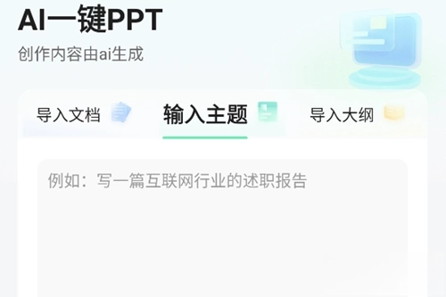 AI一键PPT是一款依托人工智能技术开发的PPT自动生成工具,致力于协助用户完全告别复杂的幻灯片制作步骤。借助前沿的自然语言处理与计算机视觉技术,用户仅需输入主题或文案等基础内容,就能迅速产出专业水准的演示文稿,助力用户轻松达成“无需设计基础,也能输出高质量成果”的目标。