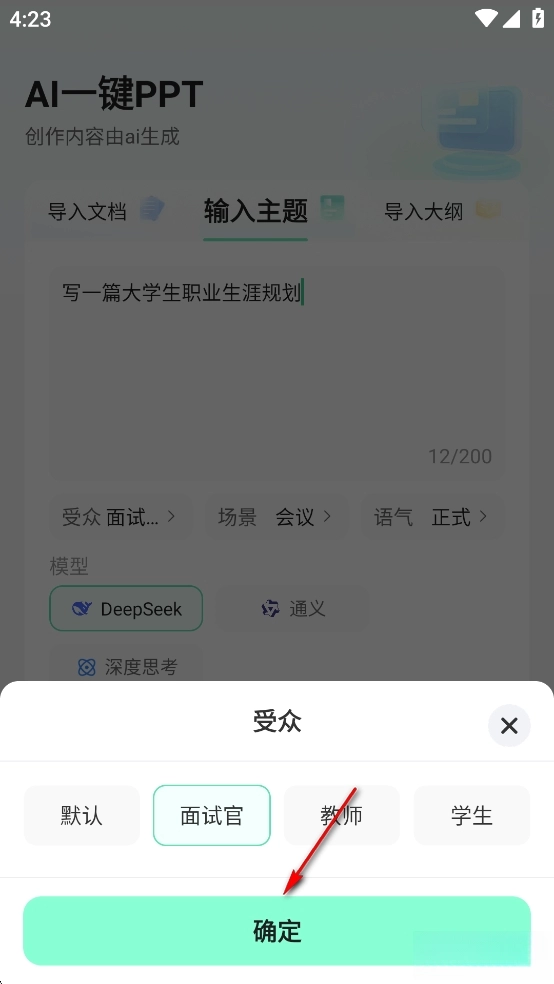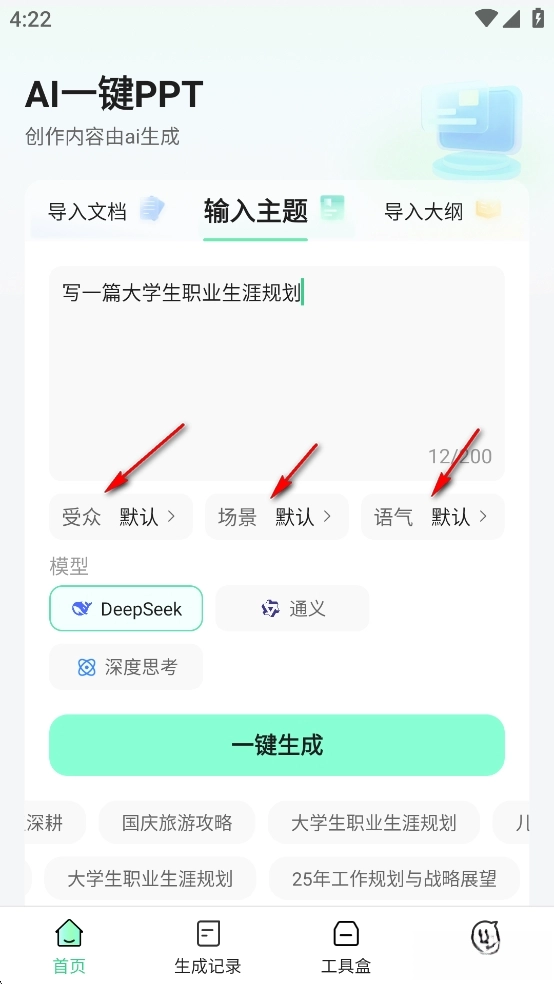 AI智能生成功能:只需输入主题或关键词,系统就能自动产出完整的PPT内容,涵盖大纲、文案以及排版等部分。
