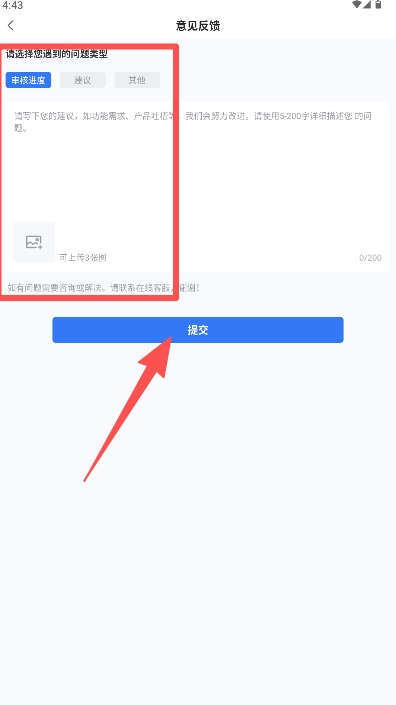 进入“意见反馈”页填写内容后点击“提交”按钮。