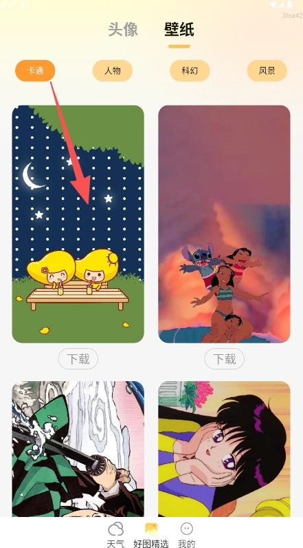 点击壁纸功能选择“卡通”等分类标签。