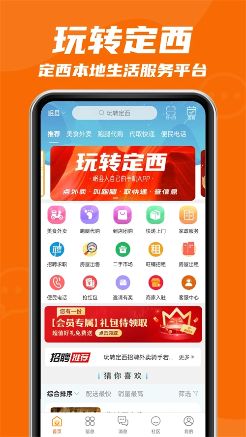《玩转定西》是一款为定西市量身打造的本地生活服务平台。平台整合了多元生活服务功能,涵盖美食外卖、跑腿代购、快递代取、超市便利、便民电话、求职招聘、家政服务、房屋租售等,用户可按需选择功能,足不出户即可通过手机享受便捷高效的本地生活服务。